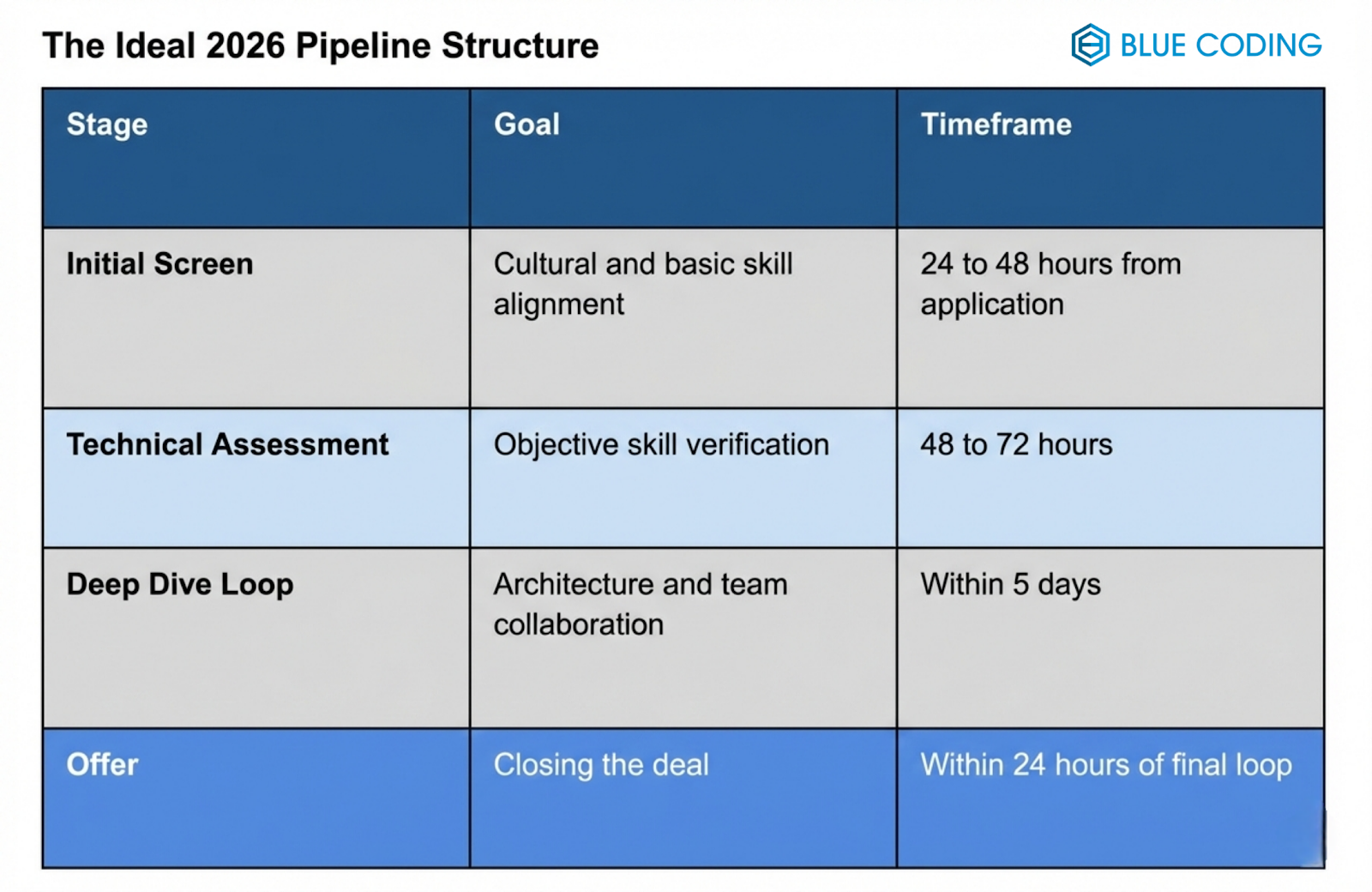 At Blue Coding, we know that an inefficient technical interview pipeline prevents you from hitting your product milestones and staying ahead of the competition. Since our inception, we have dedicated ourselves to refining the technical recruitment experience for both companies and developers. We specialize in identifying the top tier of global talent through a developer hiring process that is as rigorous as it is rapid. By utilizing the latest technical screening tools and a human centric approach, we mirror the efficiency of the Ideal 2026 Pipeline Structure shown in the image above. Contact us today to discover how our tailored hiring solutions can help you secure the engineering talent you need to grow. We also offer an initial complimentary strategy call!