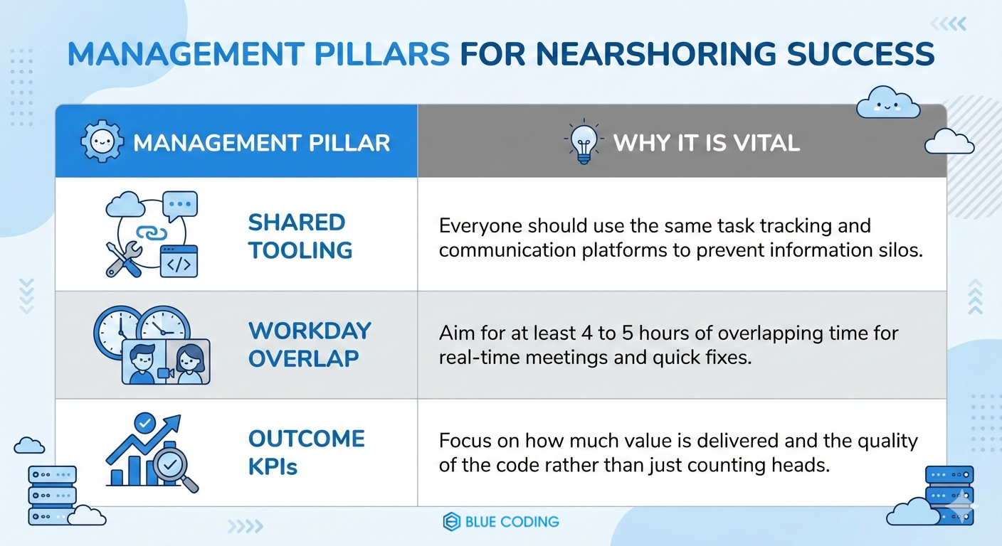 One of the most important nearshore outsourcing lessons we have learned is that you cannot just hire people and hope for the best. You need a framework to manage the work. Partnerships fail most often during the handoff phase, where requirements get lost in translation. Governance is the structure that keeps everyone on the same page. It includes the tools you use, the frequency of your meetings, and the way you measure success. To fix this, successful companies use a model of high visibility. You need to know exactly what is happening in every sprint without having to micromanage every hour of the day. Without a clear governance structure, you end up with a black box where tasks go in and code comes out, but nobody knows if that code is actually solving the business problem.